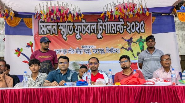 স্পোর্টস ডেস্কঃ ঝিনাইদহের মহেশপুরে উদ্বোধন হলো মিলন স্মৃতি ফুটবল টুর্নামেন্ট ২০২৫। ১২ সেপ্টেম্বর ২০২৫ ইং রোজ শুক্রবার বিকাল ৪ ঘটিকায় মহেশপুর পৌর ক্রীড়া সংস্থা এর আয়োজনে খেলাটির উদ্বোধন করেন, ঝিনাইদহ
